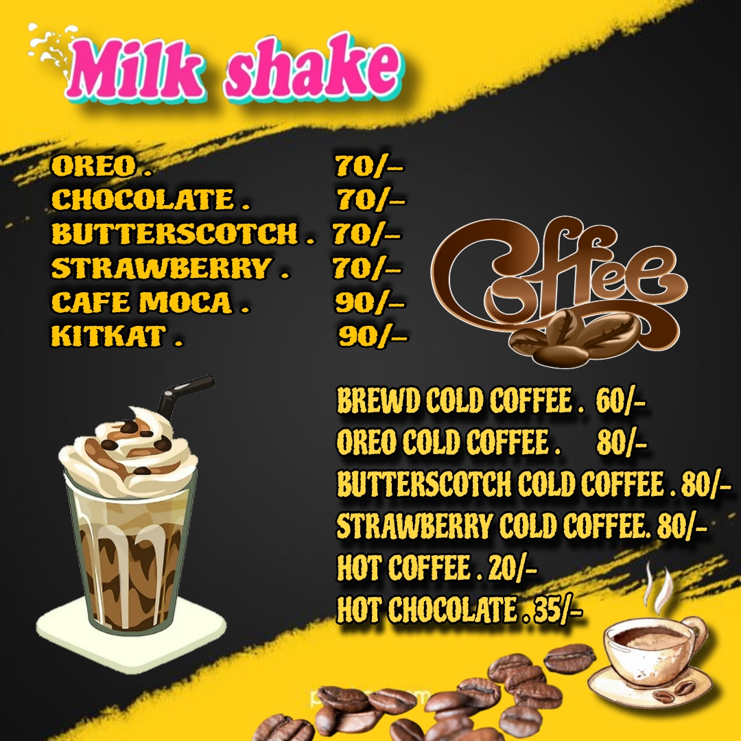 - Milkshakes - ₹35.00: Dive into an array of flavors, from cold coffee to fruity delights, each sip is more refreshing than the last.